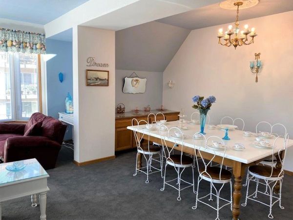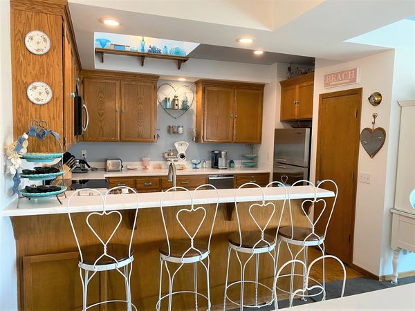 Elegantly decorated in a romantic beach chic cottage style, with comfortable reclining leather living room furniture, formal ining table seating for 8 + 4-seat breakfast bar, and a delightfully equipped kitchen including Service for 12 of Rosaline glass Luncheon & Salad dishes, cereal bowls, sundae bowls, wine stems, footed cordials, tumblers, mugs; + 5 pc. graduated serving bowl set, 2 Milk & Ice Tea Pitchers; 8 pc. glass Pyrex incl. 2 covered casseroles + Batter Jug, 5 S/S mixing bowls w/lids, Farberware cutting knife block w/sharpener, S/S Cocktail Shaker, 11 pc. professional Circulon Cookware w/glass lids, Cuisinart 4-slice Toaster, Electric Tea Pot, Keurig Coffee Maker, 8-cup Perculator, flip style Waffle Maker, Blender, Mixer, Air Fry Oven, Pancake Grill, D/W, and Garbage Compactor. Flatware w/dessert forks + Alexis 7 pc. serving set. Minton China can also be left out for an additional deposit.